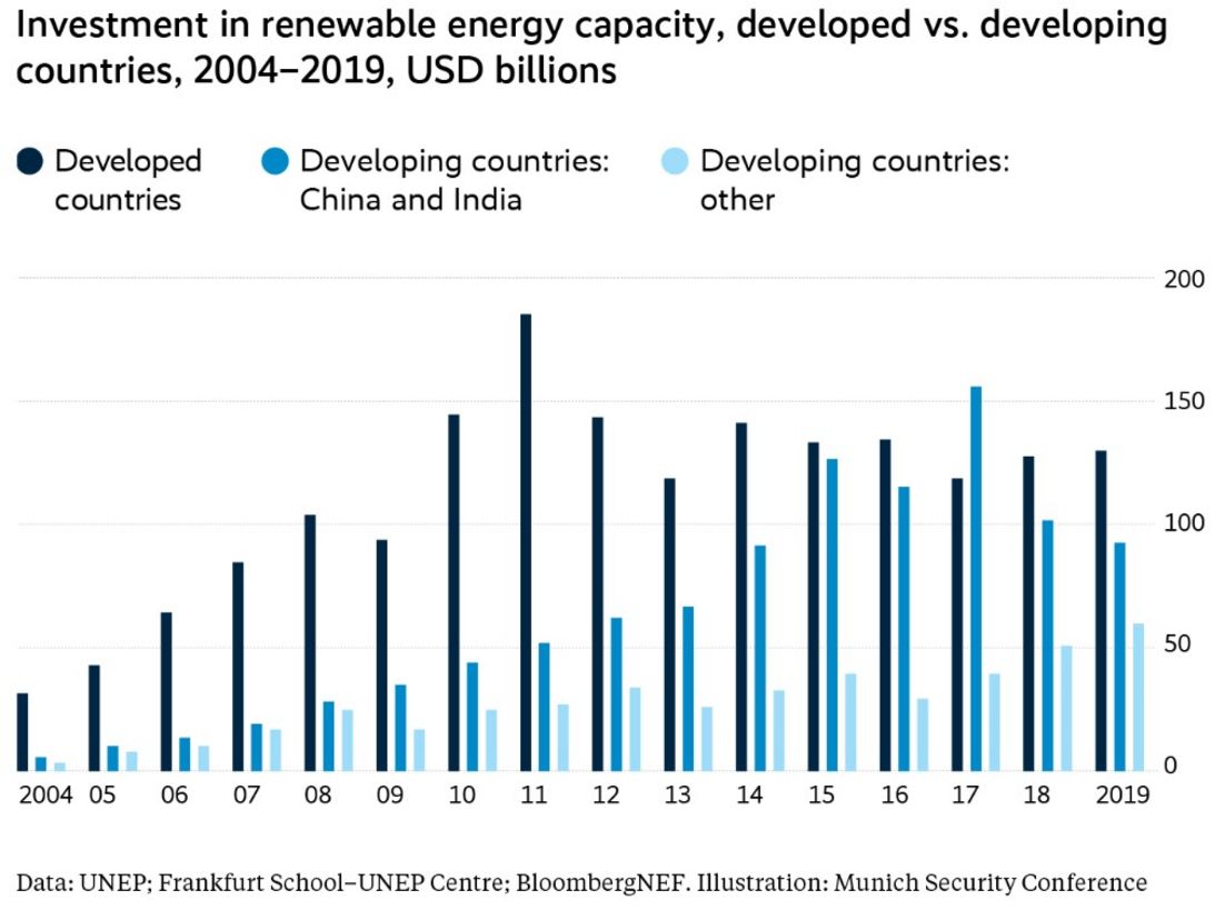 Ein Beispiel ist der zunehmende Wettbewerb um Führung in der Grünen Wirtschaft. Da kohlenstoffarme Technologien ein Schlüsselfaktor für wirtschaftliche Wettbewerbsfähigkeit und Wohlstand sind, sehen manche AnalystInnen in ihnen das "geoökonomische Schlachtfeld der Zukunft". Mit der zunehmenden strategischen Rolle grüner Energietechnologien für den geopolitischen Wettbewerb nehmen auch die Sorgen des Westens über die führende Position Chinas in diesem Feld zu. So warnte beispielsweise der derzeitige US-Klimabeauftragte John Kerry Ende 2019, "dass es töricht wäre, eine Weltordnung, die zu abhängig von Öl aus dem Nahen Osten ist, durch eine zu ersetzen, die zu abhängig von chinesischer Technologie ist".